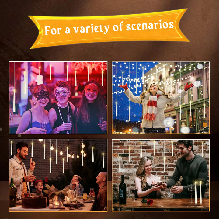 Each set includes 10, 12, or 20 LED candles, a wand remote control, and stick hooks. The candles operate with AAA batteries (not included), making setup quick and simple.